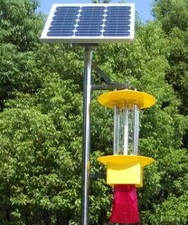 太阳能杀虫灯是利用太阳能电池板作为用电来源,其将白天太阳能发的电贮存起来,晚上放电给杀虫灯具,供其工作。杀虫灯具是利用昆虫具有较强的趋光、趋波、趋色、趋性的特性原理,确定对昆虫的诱导波长,研制专用光源,利用放电产生的低温等离子体,紫外光辐射对害虫间生的趋光兴奋效应,引诱害虫扑向灯的光源,光源外配置高压击杀网,杀死害虫,使害虫落下专用的接虫袋内,达到灭杀害虫的目的。