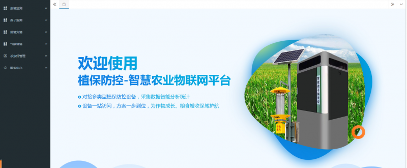 智能虫情测报系统:自动虫情测报灯,主要由害虫诱捕装置、害虫收集装置、害虫灭杀装置、害虫散虫装置、高清摄像机与光源、控制器、显示器、电源与防雷系统、网络传输模块组成。测报灯会对设定时间段内收集的害虫进行分段存放、拍照和计数,内置2000W高清工业摄像头,通过系统设置或网络远程设置后自动拍照将现场拍摄的图片无线发送至监测平台,平台整理并计算每天的数据,形成数据库,实现自动识别害虫的种类及数量。根据采集的图片与数据,分析人员及农业专家可对当地的病虫害发生趋势做出预测和诊断。