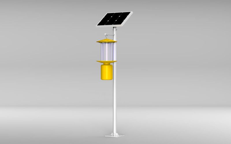频振式太阳能杀虫灯杀虫种类广,可诱杀多种蔬菜害虫,如斜纹夜蛾,甜菜夜蛾、银纹夜蛾、烟青虫、黄条跳甲,蝼蛄等。该灯的杀虫机理是运用光、波、色、味四种诱杀方式杀灭害虫。近距离用光,远距离用波,加以黄色外壳和味,引诱害虫飞蛾扑灯,外配以频振高压电网触杀。在杀虫灯下套一只袋子,内装少量挥发性农药,可对少量未击毖的蛾子熏杀,从而达到杀灭成虫、降低田间产卵量、减少害虫基数、控制害虫危害蔬菜的目的。一般在4月中旬装灯,10月撤灯,每日21点开灯,次日凌晨4点闭灯。有光控系统的灯能根据自然光的亮度自动开关。